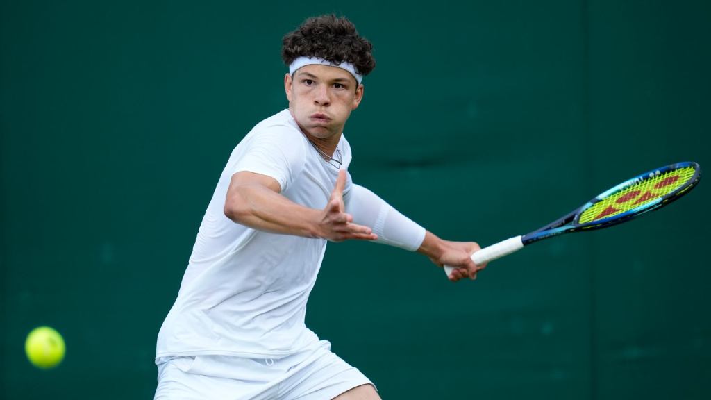 Ben Shelton of the US returns to Japan’s Taro Daniel in a first round men’s singles match on day three of the Wimbledon tennis championships in London, Wednesday, July 5, 2023. (AP Photo/Kirsty Wigglesworth)(Kirsty Wigglesworth | AP)