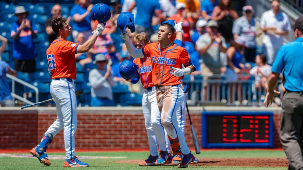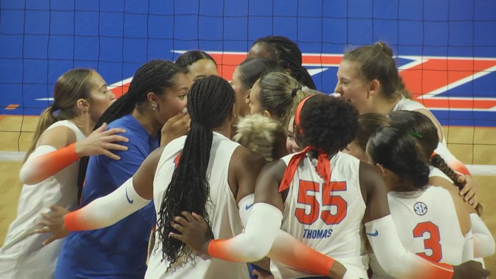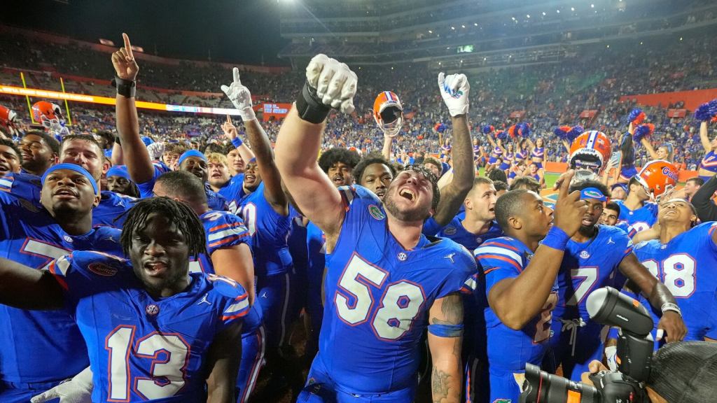 Florida players celebrate in front of fans after defeating LSU in an NCAA college football game, Saturday, Nov. 16, 2024, in Gainesville, Fla. (AP Photo/John Raoux)(John Raoux | AP)