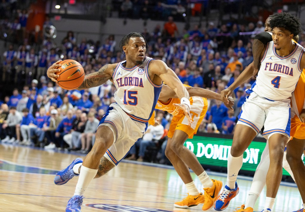 Florida guard Alijah Martin (15) moves with the ball during the second half of an NCAA college basketball game against Tennessee, Tuesday, Jan. 7, 2025, in Gainesville, Fla. (AP Photo/Alan Youngblood)
