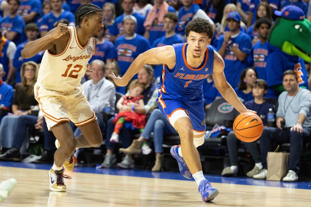 Florida guard Walter Clayton Jr. (1) drives past Texas guard Tramon Mark (12) during the second half of an NCAA college basketball game Saturday, Jan. 18, 2025, in Gainesville, Fla. (AP Photo/Alan Youngblood)